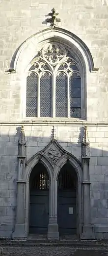 L'entrée en façade ouest de la tour se fait par un portail gothique présentant deux arcs brisés, cantonnés de pilastres surmontés de pinacles à crochets. Entre les deux arcs brisés, l’écoinçon représente Saint-Georges à cheval terrassant le dragon; sous cet écoinçon on découvre un petit personnage à genoux ; il s’agit d’une copie réalisée lors de la restauration du parement calcaire de la tour en 1874 par l’architecte Halkin. L’original de cette sculpture a été posé avec son support contre le bas-côté sud, voisinant ainsi les pierres tombales des notables des XVIIe et XVIIIe siècles. Ce personnage à genoux suggérait sans doute à l’origine l’attitude à adopter dans le sanctuaire.