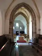 L'église, qui se dresse comme une vigie sur une haute colline ronde[note 1], possède une nef unique, précédée à l'ouest d'un porche, suivi d'un clocher-tour, à plate-forme défensive, fortifié au XVIe siècle[2], et d'un chœur à chevet plat.