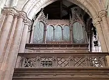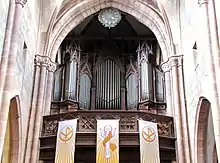 L'orgue de Johann Andreas Silbermann se trouvant autrefois dans l'église est transféré à l'église des Dominicains de Colmar en 1896. Il est remplacé en 1896 par un instrument de Martin Rinckenbach (1834-1917), dans un buffet de Théophile Klem, qui exécute également le garde-corps de la tribune. Il s'agit d'un orgue à cinq plates faces et deux tourelles. Une nouvelle façade en étain est installée en 1924 mais l'orgue est endommagé par des obus en 1944. Il fait l'objet d'une modification de sa composition par Schwenkedel en 1954 (5 jeux romantiques supprimés pour faire place à des jeux aigus étrangers à l'esthétique)[2], puis en 1975 d'une révision et transformation par Alfred Kern. En tout, l'instrument a perdu 8 de ses jeux d'origine[3]. Le garde-corps figure les armoiries de la ville de Sélestat.