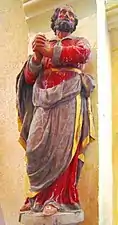 - Deux statues de bois polychromes du XVIIe siècle représentent les apôtres Pierre et Paul[6].