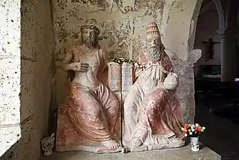 - Deux statues de pierre polychromes du XVIIe siècle, le Christ en majesté et le Père, représentent la sainte Trinité ; la colombe symbole du saint Esprit manque[3].
