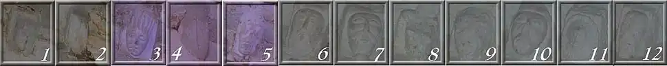 Les églises édifiées durant l'âge roman, respectaient une logique d'agencement. Celle-ci attribuait volontiers le côté sud aux personnages du Nouveau Testament[22]. Sur le versant sud, douze personnages apparaissaient jusqu'au XIXe siècle à la vue des fidèles. S'il s'agit des douze apôtres, on peut tenter de les identifier selon l'ordre dans lequel ils apparaissent dans le canon de la messe. Selon Viollet-le-Duc[21]: « Dans le canon de la messe, les douze apôtres sont désignés dans l’ordre suivant : Pierre, Paul, André, Jacques, Jean, Thomas, Jacques, Philippe, Barthélemy, Matthieu, Simon et Taddée ». Il arrive qu'un évangéliste prenne la place d'un apôtre[21]. L'évangéliste Marc[21] prend parfois la place de Simon, le onzième apôtre dans l'ordre du canon. Le modillon "11" porte un personnage stylisé avec une crinière. La forme allégorique, proche du tétramorphe à travers laquelle Marc est le plus souvent représentée dans la statuaire chrétienne : celle du lion.