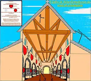 La nef apparaît pauvre et dépouillée face à la richesse du chœur. Mais un autre type d’expression artistique s'y illustrait : la peinture murale. C’est au cours de la restauration du milieu du XXe siècle, que l’on mit en évidence cette décoration. La nef était alors recouverte d’un enduit lui donnant uniformément une couleur blanche. La décision fut prise de laisser les pierres apparentes et de décaper cette couverture[13]. Lors de cette opération les ouvriers ont découvert plusieurs blasons armoriés. Ils ne furent pas identifiés, seules leurs positions ont été relevées par les soins de l'abbé Auguste Lefort. Ils étaient à mi hauteur entre les arches et les fenêtres romanes comme le montre le schéma[31]. Ainsi, les bienfaiteurs de l’église avaient le droit de faire figurer leur blason familial contre une participation financière à l’entretien et à la protection de l’église.