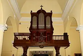 Juste devant les orgues, le plafond de la nef est orné d'un motif peint et en relief figurant des violons, des hautbois, un pupitre et une couronne de fleurs.