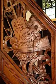 Sur la rampe de son escalier d'accès sont sculptées la tiare papale, la Bible, les tables de la Loi et la croix.
