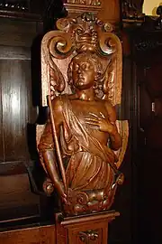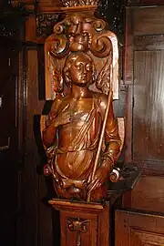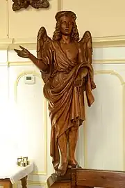 Plus en avant se dressent, à gauche et à droite, deux belles statues en chêne figurant des anges coiffés de couronnes de laurier et habillés de toges au drapé élégant.