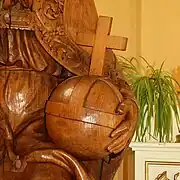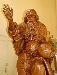 À gauche de l'autel se dresse une imposante statue en chêne de Dieu le Père bénissant de la main droite et retenant de la main gauche l'orbe posé sur ses genoux, un globe coiffé d'une croix symbolisant sa domination sur le monde.