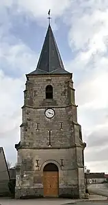 La tour-clocher, datée de 1752 avec un toit en forme de flèche, a subsisté après les combats de la Grande Guerre, il renferme deux cloches. L'église actuelle a été construite en brique. Elle ne comporte pas de transept et forme un vaisseau uniforme réunissant la nef et le chœur.