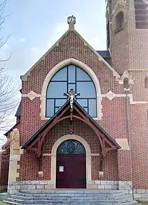 Le monument est construit en brique sur un soubassement de grès. Les ouvertures sont soulignées par un encadrement de pierre. Le plan s'éloigne du plan basilical traditionnel mais conserve les trois éléments : nef, transept et chœur. La façade est percée d'un portail protégé par un auvent décoré d'un crucifix. Une large baie vitrée surmonte le portail. Un clocher-tour flanque l'entrée côté sud. La particularité architecturale de ce clocher, qui culmine à 36 m de hauteur, est sa flèche qui prend la forme d'un obus - cas unique en France - rappelant ainsi les ravages de la Première Guerre mondiale dans ce secteur[2].