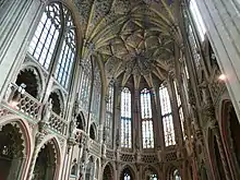 Parmi les éléments les plus remarquables, la nef, véritable dentelle de pierre ; la voûte comptant plus de 150 clés de voûte dans la nef centrale ; les stalles du XIVe siècle ; le buffet d'orgues Renaissance et son instrument en style Renaissance reconstruit par la Manufacture d'orgues Schumacher d'Eupen[3] ; le vitrail avec les armoiries des 32 vieux métiers (XVIe siècle) ; les statues baroques de Del Cour et de son école (fin XVIIe siècle) ; et le couronnement de la Vierge (groupe sculpté du XIVe siècle).