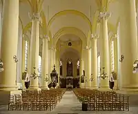 L'intérieur est également de facture baroque, mais reste assez sobre si on le compare aux édifices de même style construits à la même époque (comme l'abbaye d'Ottobeuren ou l'église de Wies, toutes deux en Bavière). Le badigeon coloré procure une agréable lumière jaune (« jaune Marie-Thérèse »). Outre l'orgue, l'église possède de belles boiseries dans le chœur et des peintures de Jean Girardet.