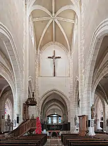 La nef est séparée du sanctuaire par une table de communion en fer forgé datant du début du XVIIIe siècle. Les arcatures du XIIe siècle, elles étaient autrefois cachées par des boiseries du XVIIIe siècle qui descendaient du bas des verrières au sol, ainsi que sur les côtés de l'entrée. Elles donnent appui à deux crédences.
