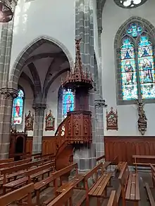 Sur la partie gauche de la nef, se tient une chaire en bois. Y sont sculptées les silhouettes de saints catholiques dont saint Joseph, saint Ambroise et saint Antoine.
