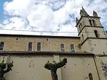 Contreforts sud de la nef et façade ouest du clocher avec son horloge.