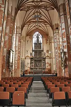À partir de 1360 environ, la construction d'un temple à trois nefs a débuté, elle fut achevée au début du XVe siècle, mais il restait de la place pour la tour, dont la construction était prévue plus tard. En 1415, commence la reconstruction du corps oriental : un nouveau chœur et un transept ont été construits. La construction d'une tour commença, mais fut interrompue par l'interdiction émise en 1453 par l'Ordre Teutonique d'ériger des bâtiments aussi hauts à proximité du château.