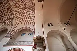 La nouvelle abside est bâtie dans le style maniériste avec des colonnes d'ordre toscan ouvrant sur la nef et un nouvel autel dans un chœur polygonal. Le grand incendie de 1677 qui détruit en partie la ville endommage le côté oriental de l'édifice, dont le toit est remplacé et le haut des murs décoré d'ornements d'ordre composite. Deux niches sont ouvertes sur le mur oriental de l'abside à la fin du XVIIe siècle pour abriter une statue de saint Jean-Baptiste (symbolisant la simplicité de la foi luthérienne des Rigois) et une statue de Salomé (symbolisant la duplicité de la foi des catholiques).