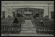 C'est un édifice, en forme de croix grecque, entièrement construit en béton et en briques apparentes, de couleur rose[4]. La façade est percée de petites ouvertures vitrées.