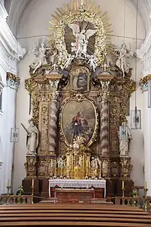 Le somptueux maître-autel provient du mobilier baroque de la cathédrale de Ratisbonne, mobilier qui a été enlevé de la cathédrale. Au-dessus de la table d'autel, s'élève le tabernacle richement décoré et doré avec une niche flanqué de deux anges adorateurs. La structure majestueuse de l'autel est soutenue par deux pilastres et deux colonnes sinueuses qui encadrent le tableau principal. Il s'agit d'une peinture à l'huile de Saint Joseph avec l'Enfant Jésus, qui est en forme de médaillon, et est entourée d'un cartouche avec au-dessus les armoiries du carmel thérésien.