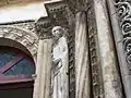 Une grande statue-colonne du XIIe siècle, haute d'environ 2 mètres, est visible sur le jambage de droite du grand portail. Avec ses fines draperies de pierre, elle représente un prophète et provient de l'ancien portail. Depuis le XVIIe siècle, elle avait été placée comme meneau dans les abat-son de la tour, elle fut descendue en 1907.