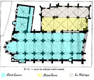 Une particularité de Saint-Lazare apparaît sur le plan : la façade n'est pas perpendiculaire à l'axe de la nef. Une autre irrégularité attend le visiteur ou le fidèle : le chœur se situe 2,50 m en dessous du portail, différence de niveau rattrapée par 17 marches et de grands paliers obliques