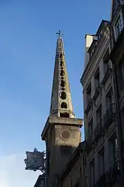 Initialement, un campanile s'élevait à la croisée du transept. Celui-ci est détruit par la foudre en 1740, et remplacé en 1765 par le clocher actuel, haut de trente mètres. Celui-ci est remarquable par sa forme d'obélisque et ses nombreux ajours, afin d'éviter toute prise au vent qui souffle fortement sur l'île. Une lettre conservée à Amiens, dans laquelle l'architecte Oudot de Maclaurin indique qu'il a travaillé, vers 1765, à l'église Saint-Louis-en-l'Île, l'a amené à proposer de lui attribuer l'obélisque de cette église, œuvre originale dont l'architecte était alors inconnu[5]. Léonore Losserand[6] a donné le nom de l'architecte à partir des comptes de la fabrique de l'église : François Antoine Babuty, qui se faisait appeler François Antoine Babuty-Desgodets par reconnaissance envers son grand-père Antoine Desgodets qui l'avait élevé.