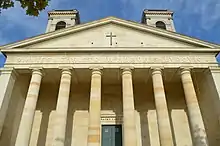 L'architecture extérieure de l'église est néoclassique avec en façade un portique de six colonnes et deux pilastres aux chapiteaux d'ordre toscan ouvrant sur un « pronaos in antis ». Ces éléments, construits avec de la pierre calcaire de Charente acheminée depuis Taillebourg (comme le reste de l'édifice), sont surmontés par un entablement et un fronton triangulaire. Plus à l'arrière, deux clochers carrés aux pilastres ioniques s'élèvent à une trentaine de mètres au-dessus du sol.