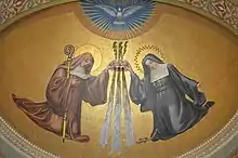 En grisaille, saints Louis de Gonzague, Bernard, Alphonse de Liguori, Anselme, Dominique et François d’Assise sont représentés, ainsi qu’une Assomption de la Vierge.
