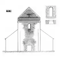 Depuis une époque indéterminée, la façade occidentale est cachée presque entièrement par le bâtiment de l'ancien prieuré, qui a également servi de presbytère. La façade était pourtant la partie la plus intéressante de l'extérieur de l'église, car son pignon a bénéficié d'une modeste ornementation. Elle consiste en quatre rangs horizontaux, à savoir un bandeau biseauté à 70 cm en-dessous du sommet des murs gouttereaux ; un cordon de billettes reliant une extrémité du pignon à l'autre ; un rang de niches triangulaires de 22 cm de profondeur immédiatement au-dessus du cordon de billettes ; et un deuxième rang situé nettement plus haut. Le fond des niches est habillé d'une pierre plate, et de petites têtes saillantes ou des modillons gravés de volutes se profilent parfois entre deux niches. Mais le principal élément du décor était une croix byzantine en faible bas-relief, qui comportait un Christ en croix[17]. Cette œuvre d'une grande rareté a été enlevée et montée dans le croisillon nord avant 1913 (voir le chapitre Mobilier). Quant au portail et la fenêtre haute située dans son axe, ils étaient en plein cintre et sans caractère particulier. - Albert Lenoir a remarqué lui aussi la façade occidentale de l'église, et en publie deux dessins dans son traité sur l'Architecture monastique paru en 1856[22].