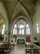 Il en va de même de la plupart des chapiteaux de la seconde travée du chœur, sauf un, qui présente uniquement des feuilles de chêne. Tous les chapiteaux du chœur ont bénéficié d'un décor polychrome, qui semble subsister d'origine dans la première travée où il est presque effacé, et qui a été refait dans la seconde travée. Les arcades autour de cette travée et ses ogives, de profil torique piriforme, ont fait l'objet du même traitement, ainsi que la petite clé de voûte sous la forme d'une couronne de feuillages. Par ailleurs, un seul chapiteau a été remplacé par un culot fruste, à savoir de l'angle sud-ouest. Dans l'abside, les fenêtres occupent pratiquement toute la largeur des trois pans de mur. Leur remplage est agrémenté de moulures toriques, même sur la fenêtre de droite, où cette mouluration manque vers l'extérieur. Seuls les meneaux de la baie d'axe conservent leurs petits chapiteaux. Ils sont situés plus hauts que les chapiteaux des ogives, qui se rapprochent beaucoup du soubassement des fenêtres et soulignent la faible hauteur sous voûte, diminuée encore par l'estrade du maître-autel. Les vitraux du XIXe siècle présentent des motifs ornementaux avec prédominance du verre blanc. Seul le médaillon de la baie d'axe est figuratif et illustre la descente de croix. Un lambris de demi-revêtement de style néogothique couvre les soubassements des fenêtres et la partie inférieure des murs. D'un bel effet, il préserve les colonnettes gothiques, qui ont souvent été coupées dans de pareilles circonstances. Le maître-autel avec son tabernacle et l'autel servant aux célébrations sont également néogothiques, mais sans l'exubérance et la prolifération de détails qui est souvent propre à ce style[4],[5],[6],[7].