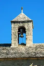 La toiture de lauzes est surmontée d'un élégant clocheton carré à quatre baies campanaires, sommé d'un toit de lauzes à flèche pyramidale.