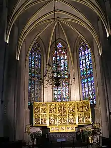 Les stalles gothiques datent du XVe siècle). Le maître-autel néo-gothique, sur le thème de la Passion du Christ, est conçu par Josef Windhausen et réalisé par Ferdinand Langenberg. La prédelle présente les quatre évangélistes et au centre Jésus en Christ pantocrator. Le retable a trois possibilités d'ouverture. Quand il est fermé (pendant le carême et l'avent) on voit, dans quatre niches gothiques dorées sur un fond bleu lumineux, des images grandeur nature en grisaille de Pierre, Martin, Charles Borromée et saint Paul. Dans cette position, les évangélistes de la prédelle sont recouverts par deux panneaux montrant en grisaille les images de quatre grands prophètes, Daniel, Isaïe, Ézéchiel et Jérémie. En position normale, quatre peintures représentent de gauche à droite l'Annonciation, la Nativité, l'Adoration des rois mages et le Couronnement de Marie au ciel. Une inscription se lit : Barend van Orley, secutus P. Windhausen pinxit. Il s'agit de Barend van Orley Albin Windhausen, un frère de l'aumônier Joseph Windhausen.