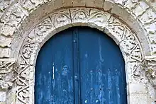 Le portail comportait, à l'origine, deux fausses portes latérales encadrant la baie centrale, et vers le haut, de chaque côté, une paire d'arcs aveugles.