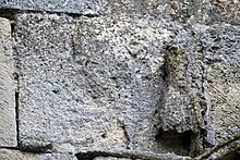 Les deux hauts-reliefs : deux grandes plaques rectangulaires sont encastrées en façade. Ils sont très érodés et difficiles à interpréter.