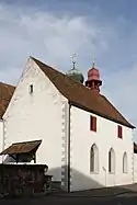 L'église est accolée au mur du vieux cimetière. Au côté sud se trouvait autrefois l'ossuaire Sainte-Anne, visible à travers une fenêtre[2]. La longue nef d'une largeur exceptionnelle[2] mène au chœur surélevé. L'abside a été ajoutée au XVIIIe siècle, tandis que la sacristie située côté sud a été élargie en 1962. Côté nord, la tour-clocher large et peu élevée repose sur un plan carré et est portée par des murs épais. Les trois horloges de la tour, réalisées en 1526 par Liechti de Winterthour, sonnent tous les quarts d'heure depuis 1604[2]. Elles acquièrent chacun une deuxième aiguille en 1961[2].