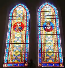 Les fenêtres sont garnies de vitraux réalisés par les ateliers Cagnart d'Amiens, dans le choeur :