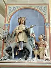 - Le groupe sculpté représentant la Charité de Saint-Martin, d'une taille impressionnante, mesure 150 cm de largeur et 160 cm de hauteur, et date de la première moitié du XVIe siècle. On le trouve dans une niche ménagée dans le pilier carré séparant la nef du chœur. Il est en bois, mais a été badigeonné et repeint par M. Fontaine en 1847. C'est à cette occasion que la figure du mendiant a été remplacée. De nombreuses églises de l'Oise, où saint Martin a toujours été très populaire, possèdent des sculptures d'une iconographie semblable. Élisabeth Bail-Dhé caractérise l'œuvre comme suit : « Saint Martin raide et à peine souriant est vêtu d'une parure d'officier et coiffé d'un chapeau au bord large et relevé. D'un geste figé, le regard tourné vers le spectateur, il partage son manteau. Son cheval richement harnaché n'est pas à la même échelle que le cavalier qui semble l'écraser. De ses yeux ronds l'animal fait également face au spectateur. À droite, un mendiant agenouillé, soutenu par une béquille, a les yeux tournés vers Martin en attente de la moitié de manteau qu'il va recevoir »[38],[39].