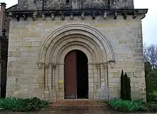 La partie romane de l'église est la série modillonnaire pour-tournant la partie basse de l'actuel clocher. Les modillons qui n'ont pas été refaits au XIXe siècle s'inscrivent dans la tradition de l'abbaye de La Sauve-Majeure et sont à dater au milieu du XIIe siècle[2]. Les représentations sont des figures traditionnelles de mise en garde contre la luxure.