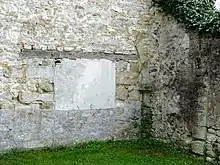- La plaque de fondation de honnête et discrète personne Mre Jean Gueret (?), prêtre de la paroisse de Saint-Martin de Follainville, est en pierre calcaire, et de petites dimensions. Son état de conservation est moins satisfaisant : la moitié inférieure de la plaque a été martelée, et un trou a été rempli avec du ciment. La date de décès ne peut ainsi plus être relevée, mais la ressemblance de l'écriture avec la plaque commémorative ne laisse pas de doute que la plaque date globalement de la même époque.