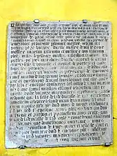 - La plaque commémorative de la dédicace de l'église est en pierre calcaire. Ses dimensions n'ont pas été prises. Elle date de 1561. Le texte est une transcription du compte-rendu de la cérémonie, qui eut lieu le 24 juin de la même année, et fut présidée par Mgr Denis Paris, évêque d'Avelonne, vicaire général du cardinal de Bourbon, archevêque de Rouen. Jehan des Portes est alors prêtre vicaire de l'église. Le collateur de la cure étant probablement encore l'abbaye Saint-Wandrille, celle-ci a la qualité de curé primitif, ce qui expliquerait que le prêtre responsable de la paroisse peut seulement se prévaloir du titre de vicaire. La plaque est bien conservée. Elle a été inscrite aux monuments historiques en mai 1988[18].