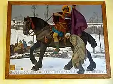 - Le groupe sculpté représentant la Charité de Saint-Martin, c'est-à-dire saint Martin à cheval, coupant en deux son manteau pour le partager avec un mendiant, est en pierre polychrome, et sculpté en ronde-bosse. Il mesure 130 cm de hauteur, et date du XVIe siècle. Le mendiant manque aujourd'hui. Le classement de l'œuvre remonte à juin 1977 seulement[13].