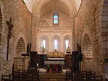 L'édifice comprend une abside à chevet plat éclairé par un triplet de fenêtres et une fenêtre haute, entourée de deux absidioles polygonales.