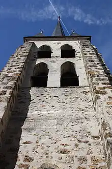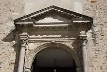 Sur la façade ouest se trouve le portail Renaissance encadré de deux colonnes et couronné d'un fronton triangulaire. Le clocher à l'origine autoportant s'élève au-dessus du bas-côté sud.