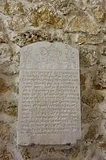 • Une plaque commémorative avec une inscription dédicatoire et l'année 1549 commémore la consécration de l'église au XVIe siècle. Des représentations en relief sont gravées dans la partie supérieure de la dalle de pierre. A gauche se trouve Saint Roch de Montpellier avec un chien à ses pieds et un ange soignant ses plaies, au milieu Saint Martin partageant son manteau avec un mendiant, et à droite Saint Sébastien, qui, attaché à un arbre, se faisant transpercer par flèches[3].