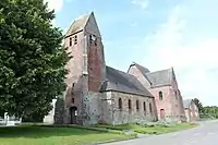 L'église fortifiée (avec des motifs décoratifs sur la façade ouest du clocher, vus de nuit).