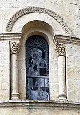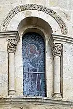La baie axiale est encadrée de colonnes avec chapiteaux non-sculptés, comme pour l'absidiole sud. Les modillons qui supportent la corniche sont tous sans décor.