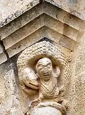 - N°4 où on voit la tête d'un homme écrasée par le fardeau du poids d'une barrique qu'il porte sur les épaules (On trouve une représentation semblable sur un chapiteau de l'abside, où l'homme porte un poisson énorme sur les épaules.)