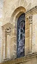Les seules sculptures sur l'extérieur du transept se trouvent sur les chapiteaux et archivoltes qui encadrent ces baies.