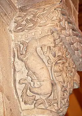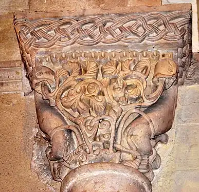 Le tailloir du chapiteau est décoré avec un entrelacs de rinceaux et de crosses.