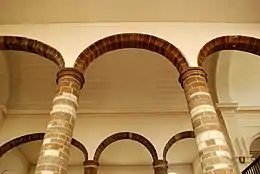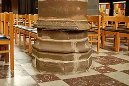 La nef est séparée des collatéraux par de belles colonnes rondes combinant grès blanc et grès ferrugineux. Ces colonnes à base et à chapiteau octogonal en grès ferrugineux supportent des arcs en anse de panier réalisés dans le même matériau.