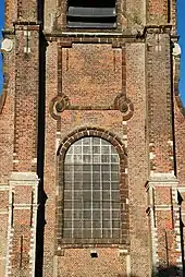 Le premier registre est orné de deux volutes en grès ferrugineux qui prolongent la verrière et supportent un motif ornemental carré en grès ferrugineux. Chaque face du second registre est percée d'une baie cintrée à encadrement de grès ferrugineux et à clé d'arc saillante. Quant au troisième registre du clocher, il est orné de grandes horloges à encadrement de grès ferrugineux et surmontées d'une boule de pierre.